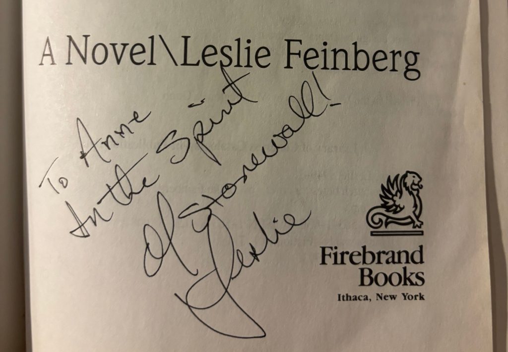 Throughout the novel Jess struggles with oppression, violence and derision as well as poverty, health concerns and housing insecurity. They also find love and belonging, professional admiration, activist communities and senses of purpose. Jess is not Leslie. Yet in some ways Jess stands in place of Leslie and many in their community in the reader’s imagination, making us able to experience those emotional truths Feinberg wanted to capture via the relative safety of a novel.