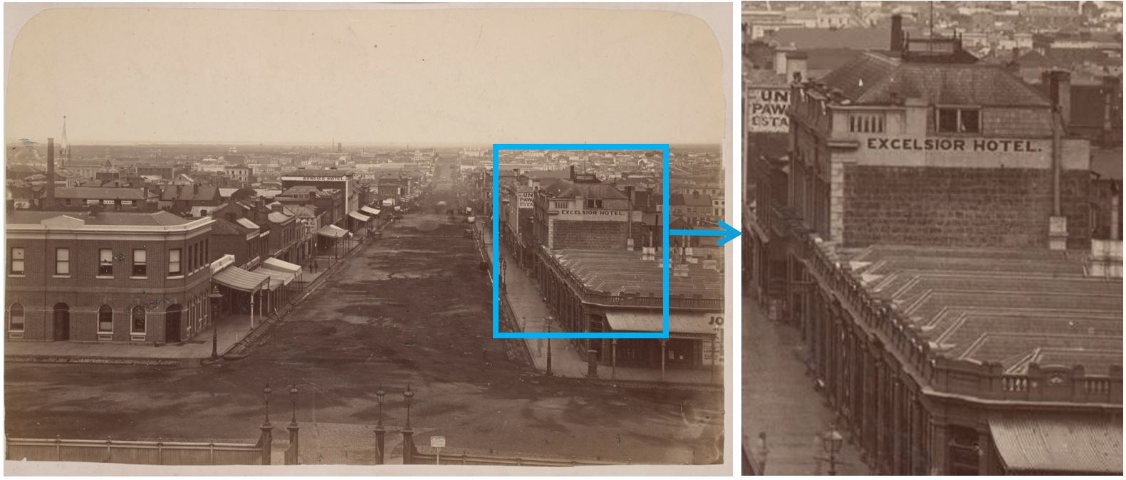 Curious stories about the hotel’s history include its extensive cellar being rented out as a night restaurant called the Chop Cellar3 and its attic rumoured to have been a hideout for leader of the Eureka Stockade uprising, Peter Lalor.4 The hotel changed ownership several times from the mid-1800s and was renamed in 1857 as the Excelsior Hotel,5 which contained an entertainment hall that was once known as the ‘Queen’s Hall’: