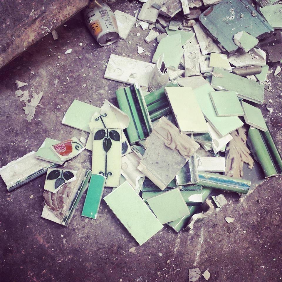 Right: Art nouveau tiles removed from theatre stairwell, 2014. Courtesy of Save the Palace