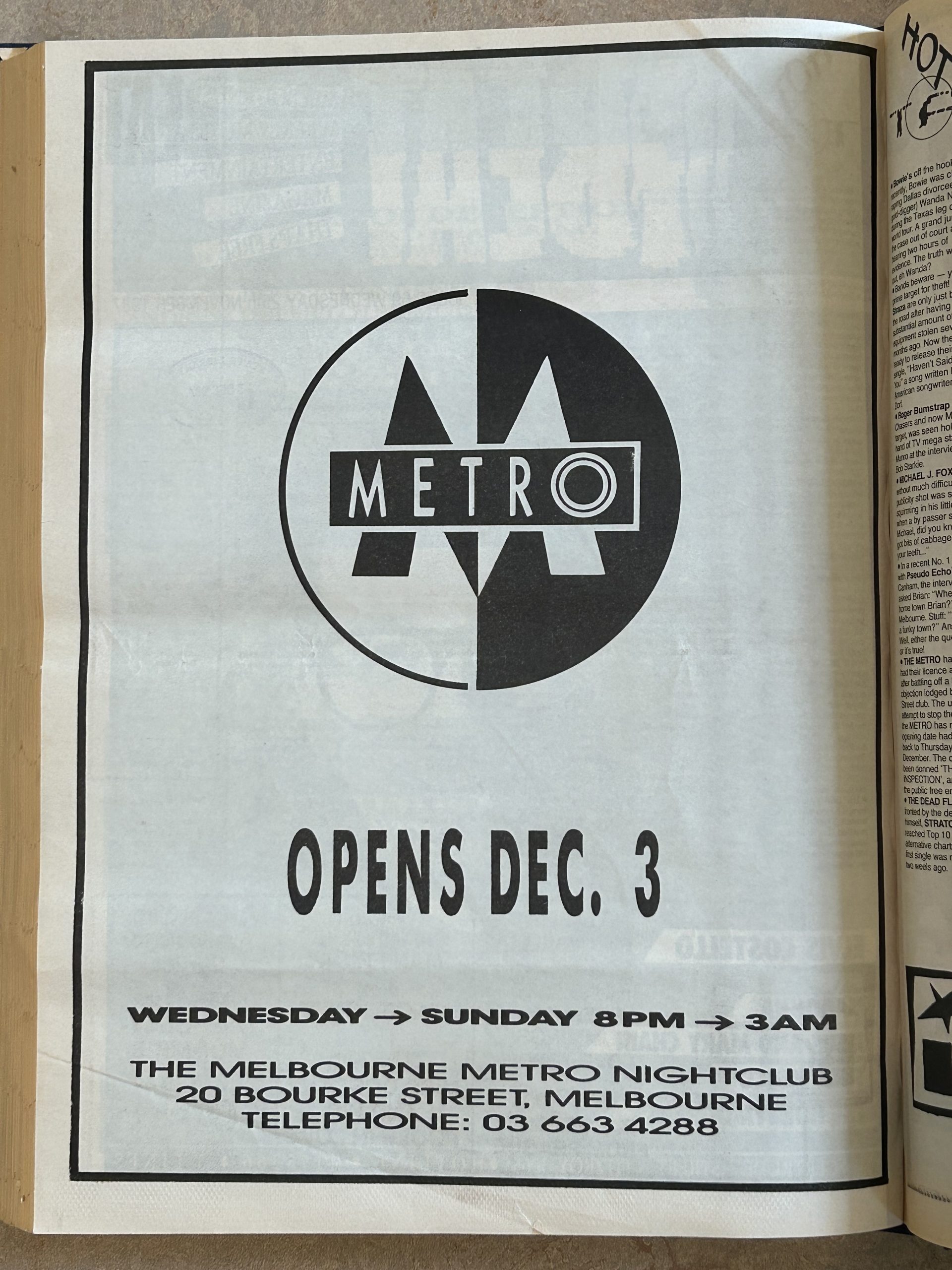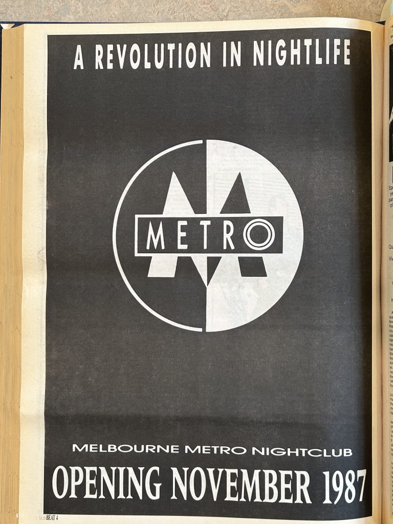 Beat magazine (Issue 68, 18 November 1987, p 4 and Issue 70, 2 December 1987, p 2) ads for opening of Metro nightclub