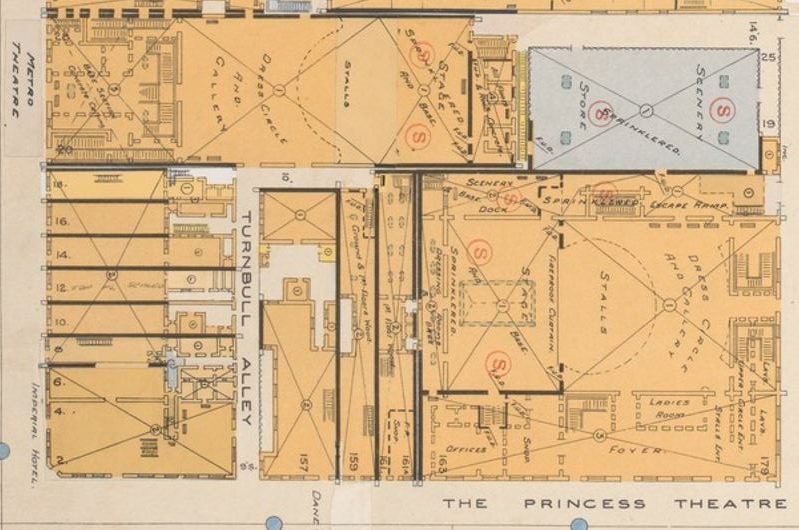 In addition to sharing owners and designers, the Palace and Princess Theatres were rumoured to have shared dressing rooms and even performers on the same night. The State Library’s Mahlstedt fire insurance plans show the theatres backing onto each other, demonstrating how this shared access would have been possible.