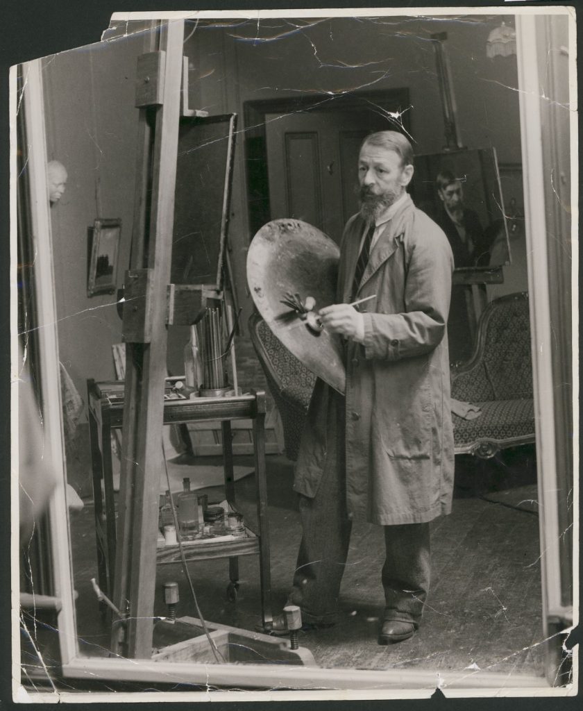 Left: Max Meldrum in his studio, 1950. Percy Spiden; H2008.121/29