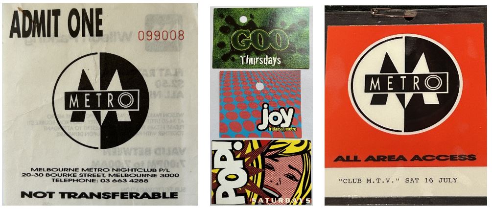 Centre: Goo, Joy and Pop passes from Metro nightclub, Collection of Melbourne nightclub cards, 1990-2010. State Library Victoria; H2022.85/1-227