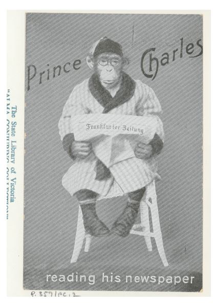 Right: Chimpanzee reading the paper, ca. 19–, postcard, W. G. Alma conjuring collection; P.357/PC.2