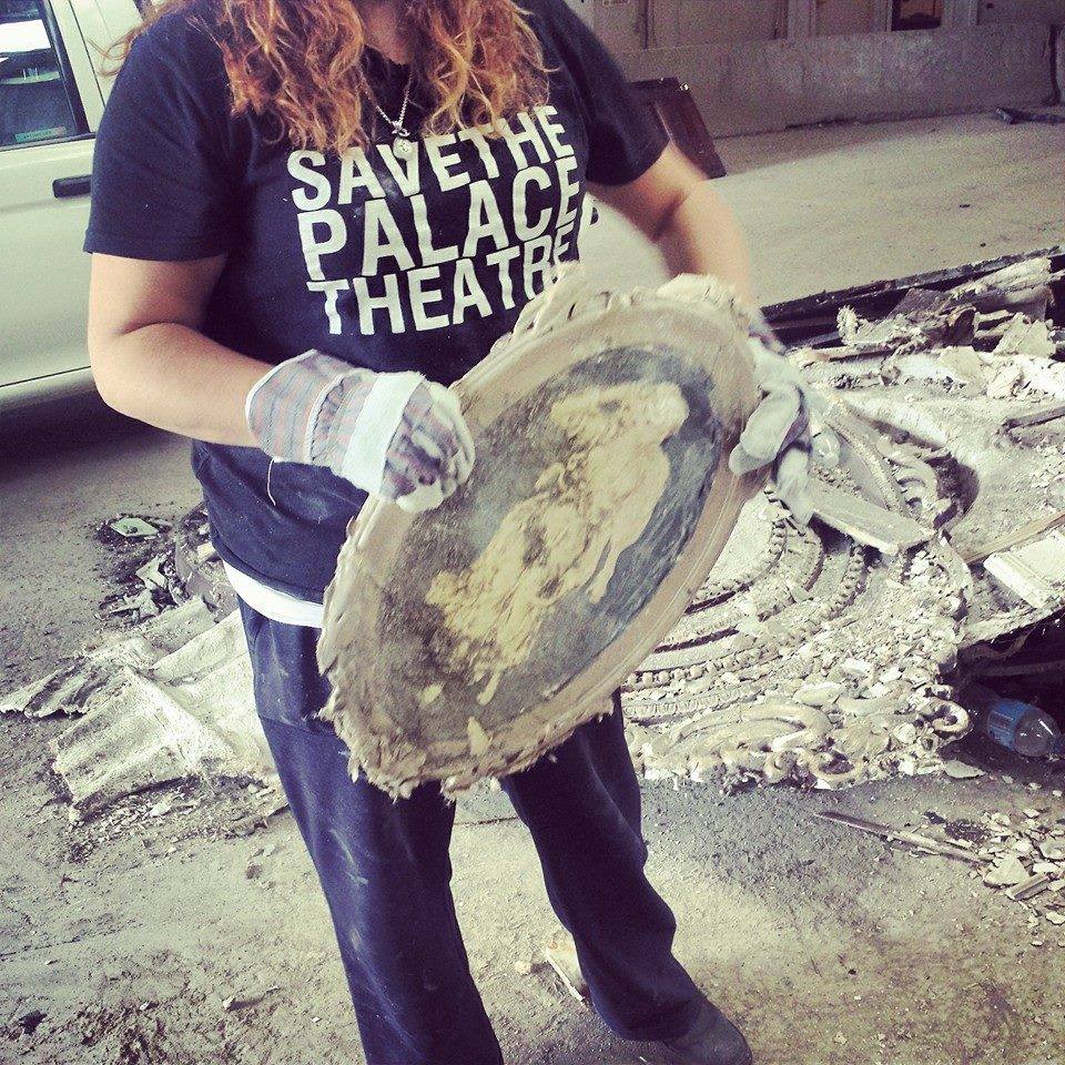 Left: Save the Palace organiser Rebecca Leslie rescuing stripped plaster decoration, 2014. Courtesy of Save the Palace