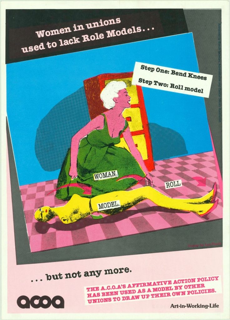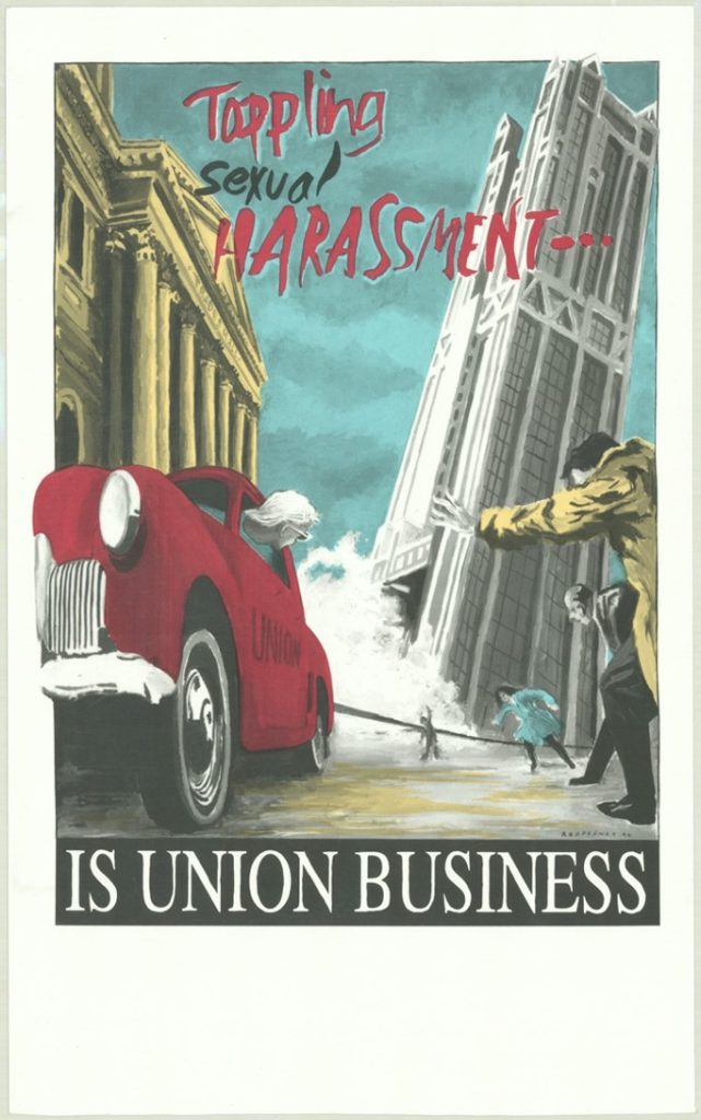 Women in Unions used to lack role models, 1987. Poster by Lyn Finch, ECPO/Administrative and Clerical Officers Association; Carol Porter, Toppling sexual harassment is union business, 1994. Screenprint by Carol Porter. RedPlanet, H2003.90/27