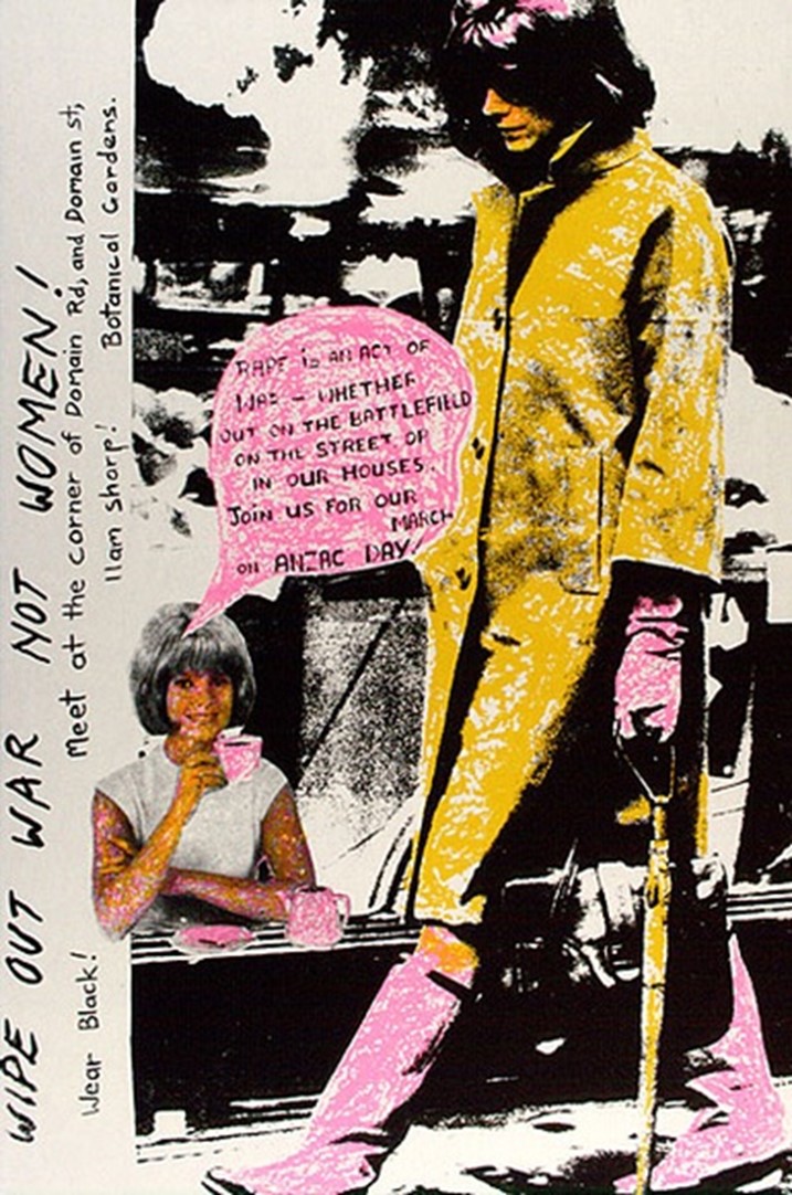 A loose all-women collective of artists, Jillposters ‘members’ came together on an ad hoc basis, often from other poster collectives. Members included Julia Church, Carol Wilson, Julie Shiels and Kath Walters from Another Planet Posters, Deej Fabyc and Alison Adler from Megalo (Canberra), Jenny Rosewarne from Sybylla, Lesley Baxter, Ally Black, Linda Brassel, Zana Dare, Maggie Fooke, Julie Higginbotham, Catriona Holyoake, Barbara Miles, Kate Reeves, Linda Rhodes, Lin Tobias, Julia Tobin, Chaz and Karen. The women of Jillposters posted their works on the streets of Melbourne without permission. They maintained anonymity by not including their names on the posters, only the collective’s logo. The collective produced posters and postcards from 1983 to 1985 on issues like peace, nuclear threat, women’s safety, childcare, racism, rape in war and child victims of war.