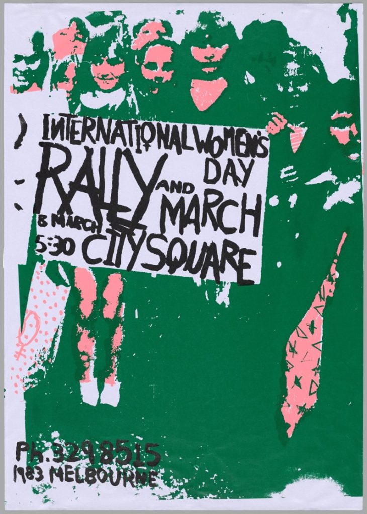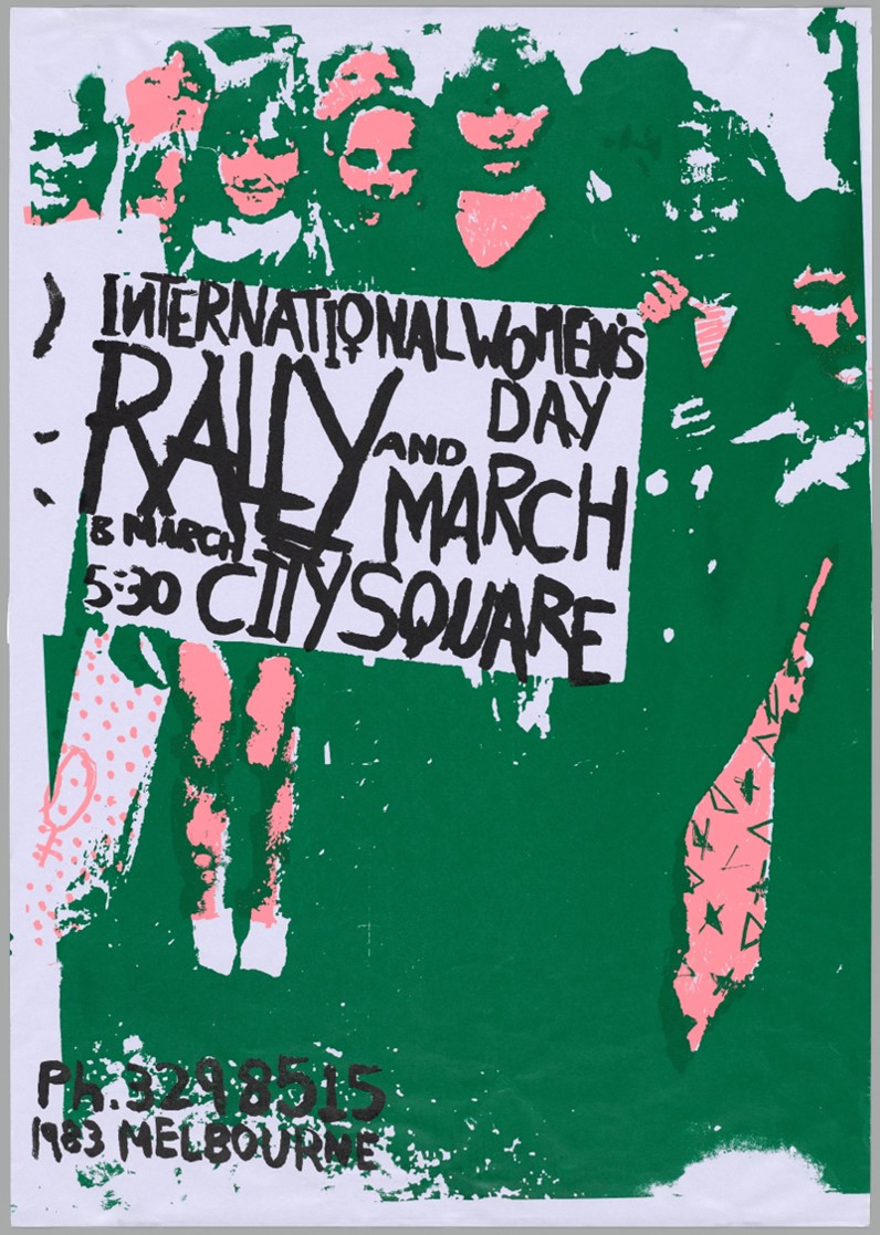 Poster collectives operating in Melbourne were left leaning in their politics, non-hierarchical in their structure, and ran on feminist principles. Their central aim was to bring what was private and personal – issues like abortion and control over one’s own body, domestic violence, rape and equal opportunity – into the realm of the public and political.