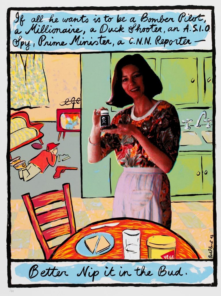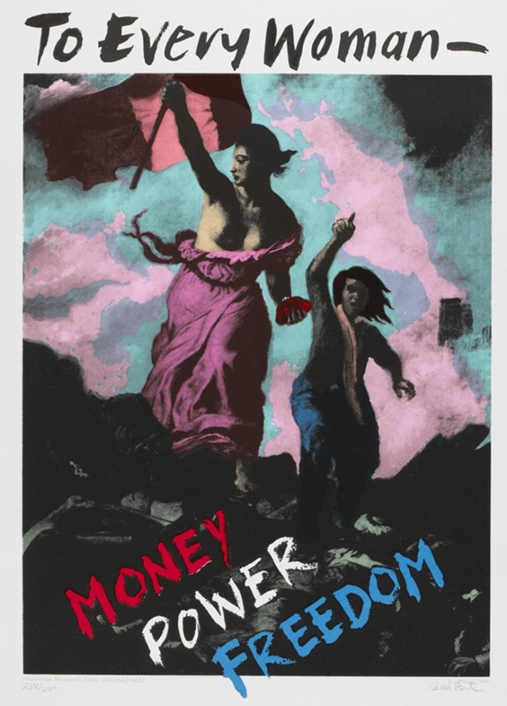 [left] Money Power, Freedom, 1994. Screenprint by Carol Porter, RedPlanet (Commissioned by the Victorian Women’s Trust), H96.27/7; [right] Nip it in the bud, 1992. Screenprint by Carol Porter, RedPlanet, H94.112/25