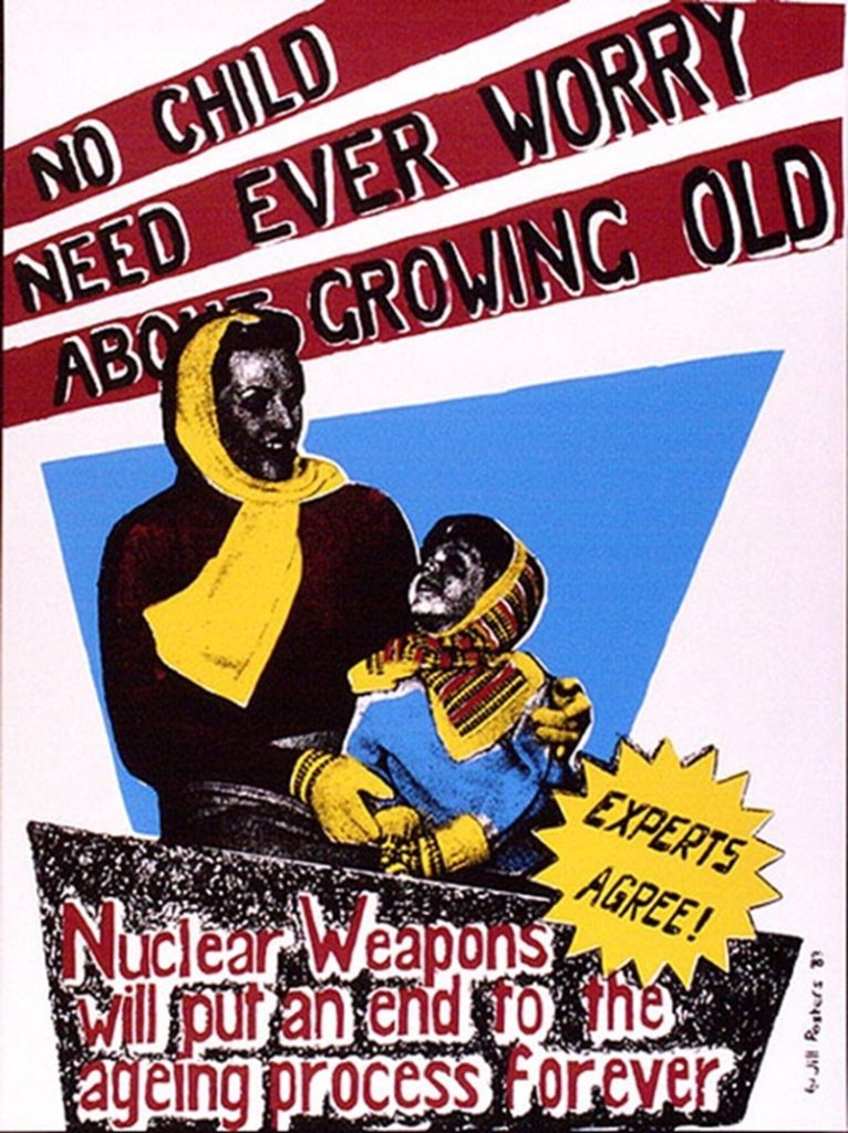 [left] Wipe out war not women! Rape is an act of war…march on Anzac Day, 1983. Screenprint by Deej Fabyc, Jillposters, H89.281/188; [right] No child need ever worry about growing old, 1983, screenprint, Jillposters, H84.248/59