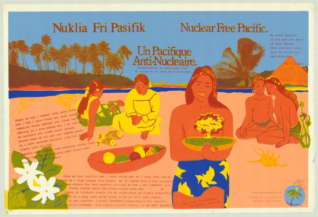 Situated in Brunswick, women artists included Dianna Wells, Wendy Black, Marina Strocchi, Tanya McIntyre, Vicky McConville, Sue Anderson, Fiona Sommerville, Angela Gee, and late in the 1980s, Carol Porter and Pamela Branas. The left-leaning sentiments of their posters and other print media champion disadvantaged and minority groups: women, people of non-English speaking origins, First Australians, and groups from the queer community. As well as commercial printing, artists worked on self-initiated community projects with migrant women, youth and unemployment groups, and on environmental issues, including addressing France’s testing nuclear devices in the Pacific and protesting U.S. nuclear bases in Australia.