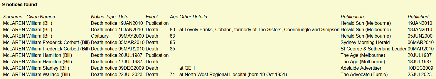 A list of deceased individuals from Ryerson Index. Dates of death notices for people with the name William (Bill) McLaren.