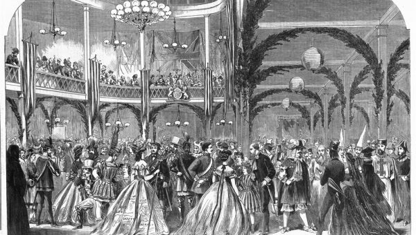 On 20 September 1866 Mrs Matilda Butters attended the Mayor’s Fancy Dress Ball in the new exhibition buildings as ‘The Press’. Designed by local dressmaker Mrs William Dobbs, the costume was constructed of silk panels printed with the front pages different Melbourne newspapers.