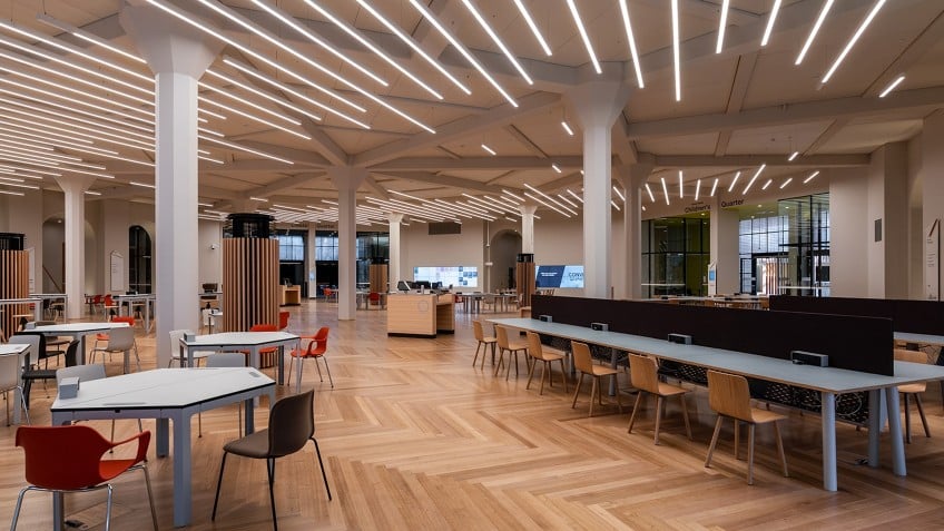 At left: Information Centre in the Dome, level 2, State Library of Victoria, 1980; H2013.383/9. At right: Information Centre c.2025