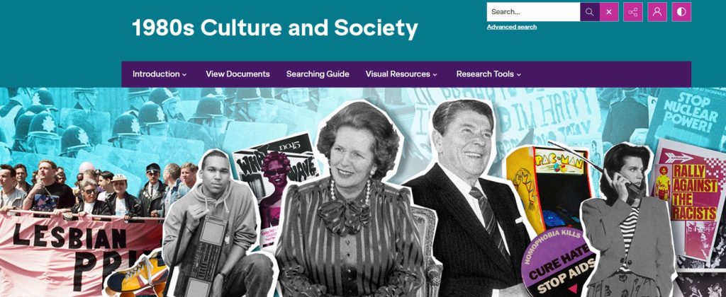 Homepage of the 1980s Culture and Society database, featuring an image of Margaret Thatcher, Ronald Reagan and various other people.