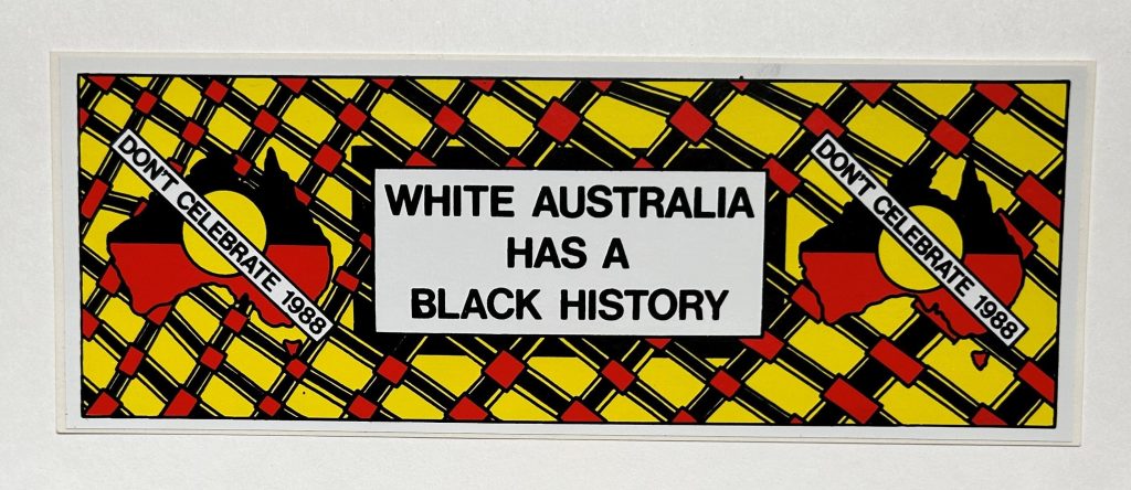 red black and yellow sticker design bearing phrases 'White Australia has a black history' and 'Don't Celebrate 1988'.