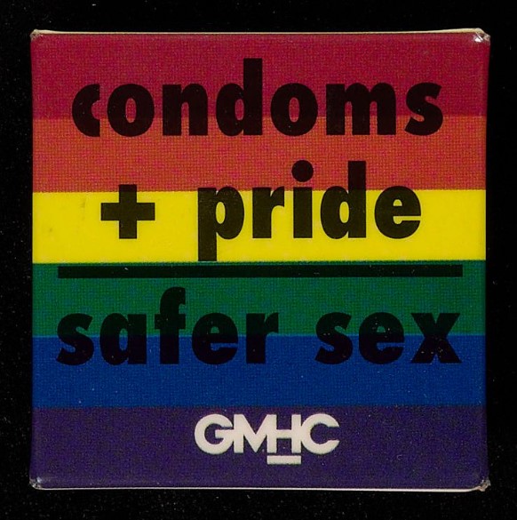 Rainbow-coloured badge with the words Condoms + pride = safer sex