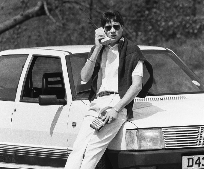 Yuppie poses by his car with his mobile phone and wallet stuffed with credit cards, 1988, Daily Mirror, © Mirrorpix.