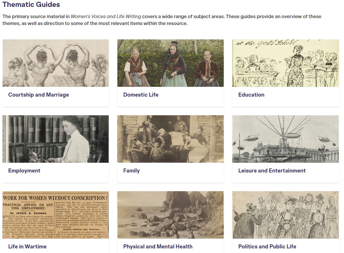 From the home page you can navigate to the resources in a few ways. The most helpful being the ‘Thematic Guides’ link which groups resources into themes such as ‘Courtship & Marriage’, ‘Life in Wartime’, ‘Politics & Public Life’, and ‘Travel & Tourism’.