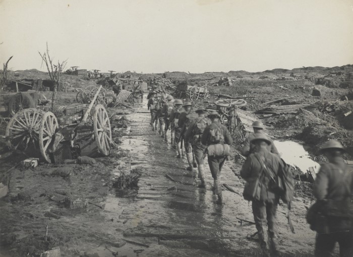 Australian troops making their way to the trenches, on October 28th 1917, along the wreckage strewn ridge of Westhoek, in the Ypres sector, in Belgium, 1917; H37630/18