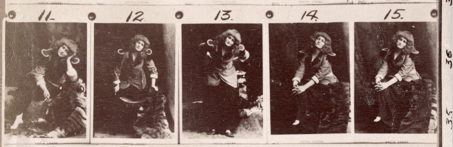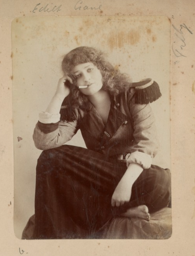 Born in the United States and daughter of a renowned New York merchant, Edith Crane’s star truly rose in Australia. Referred to in newspapers, theatre histories and captions on her photographs as ‘Australia’s Trilby’, she owned the role on these shores. The play Trilby, based on the hit 1894 novel by George du Maurier7, in which our bohemian heroine undergoes a hypnosis-based transformation, was Crane’s most famous role. Seen here in Trilby’s famous oversized military coat with bare feet and a cigarette, the look – and the outlook – became iconic. Despite its tragic storyline of lost loves, class disparity and manipulation, the most notable impacts were the naming of the Trilby hat and the ‘bachelor girl’ vision of female empowerment. These ‘bachelor girls’ modelled aspects of their lives on our heroine, daring to refer to themselves as Artists, to smoke cigarettes and drink liquor. It also spawned a craze for bare feet with one paper noting that ‘…Trilby’s feet were her glory’ (Narracan Shire Advocate, 12 May 1920).