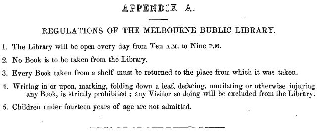- Barry, R (1877) Two papers read by Sir Redmond Barry, at the Conference of Librarians, held at The London Institution, October, 1877, G Norman and Son Printers, London, p 13. Image below List of Library Regulations from the 1858/59 Annual Report
