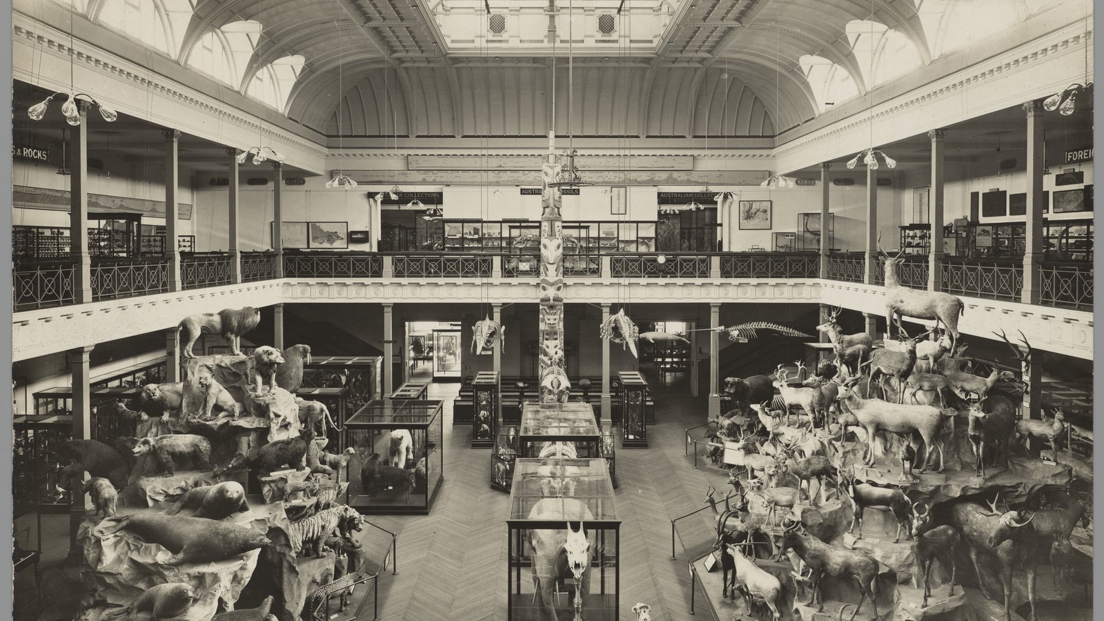 At left – Display of animals in McCoy Hall, National Museum, Melbourne, ca 1910; H12936. At right – McCoy Hall was redeveloped as the Redmond Barry Reading Room opening in 2003. Ned Kelly armour display at far end.