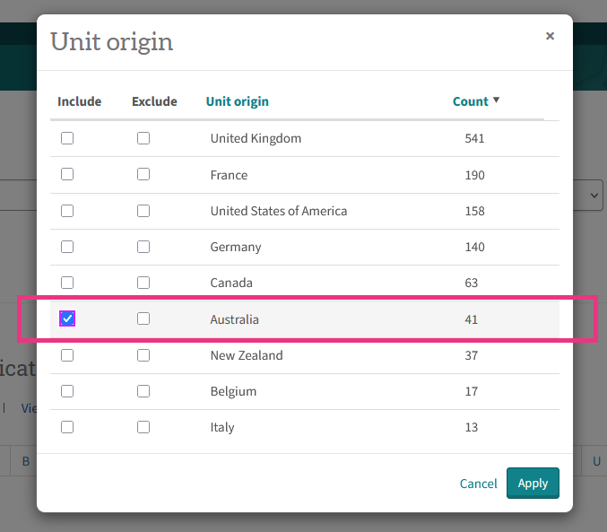 - Click More to expand the full list of origins.