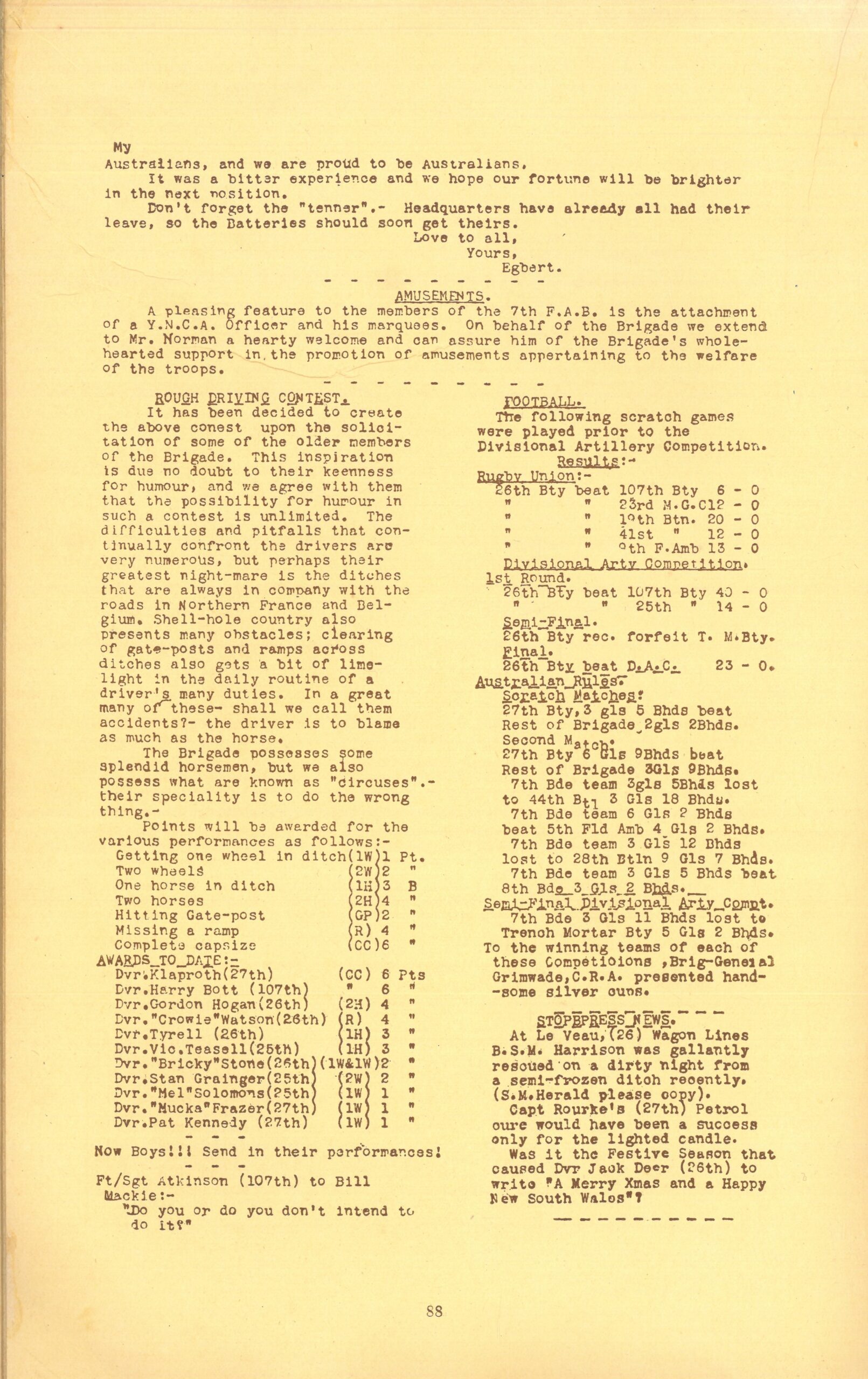 Various sports, (December 1917), The 7th Field Artillery Brigade Yandoo : containing publications of the organ of the 7th Field Artillery Brigade, Australian Imperial Forces …, pp. 88-89. State Library Victoria.