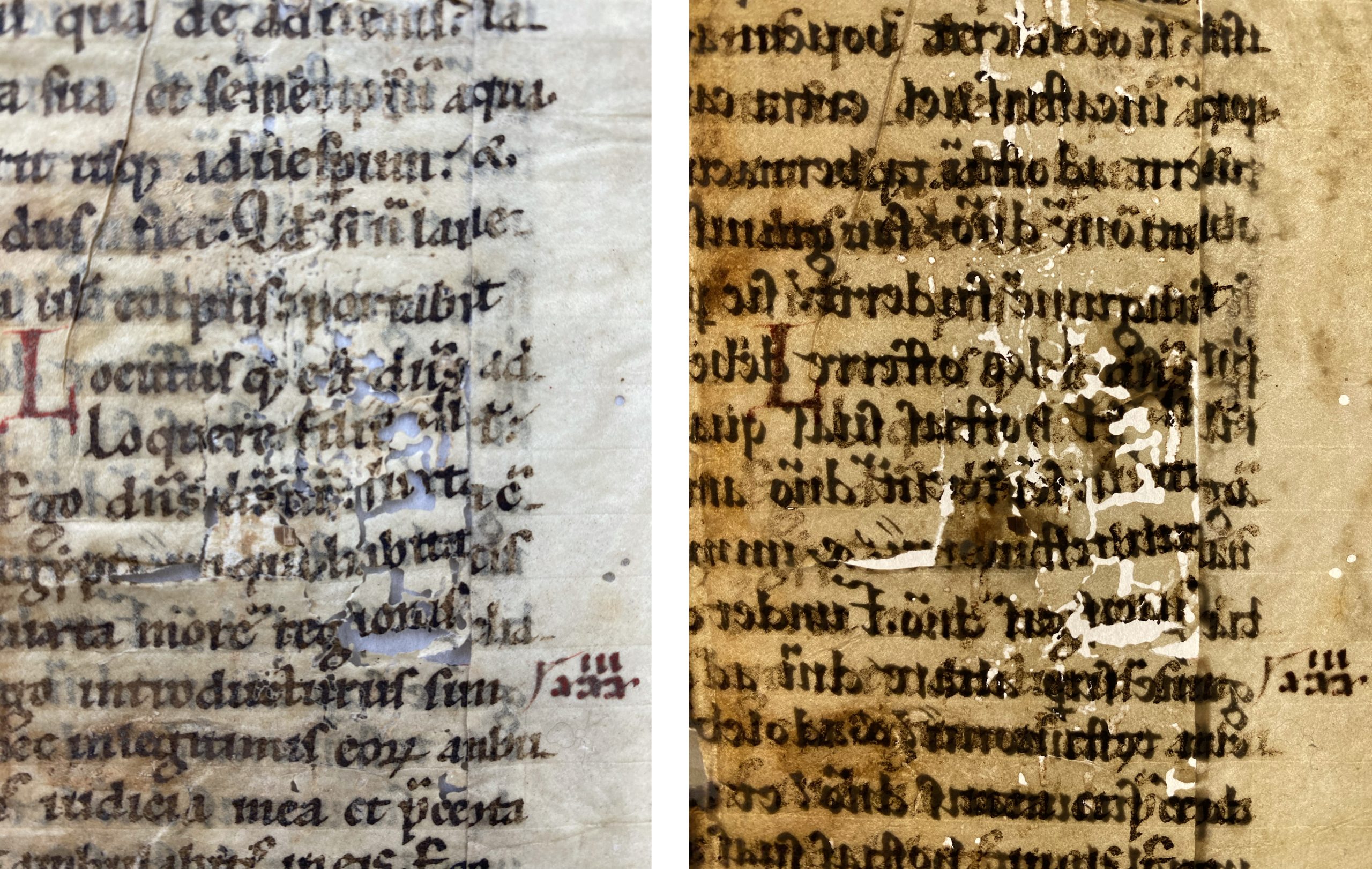 The parchment is relatively flat, with only minor dimensional change, distortion, and creases where it was manipulated for attachment as a spine lining and later separated. These processes have also resulted in cuts, splits, abrasion, and numerous voids across the parchment. The text in red and black ink displays general fading, surface abrasion and loss. In addition, there are numerous small fragments of remnant paper from the previous binding and a constellation of bookworm bore holes throughout.