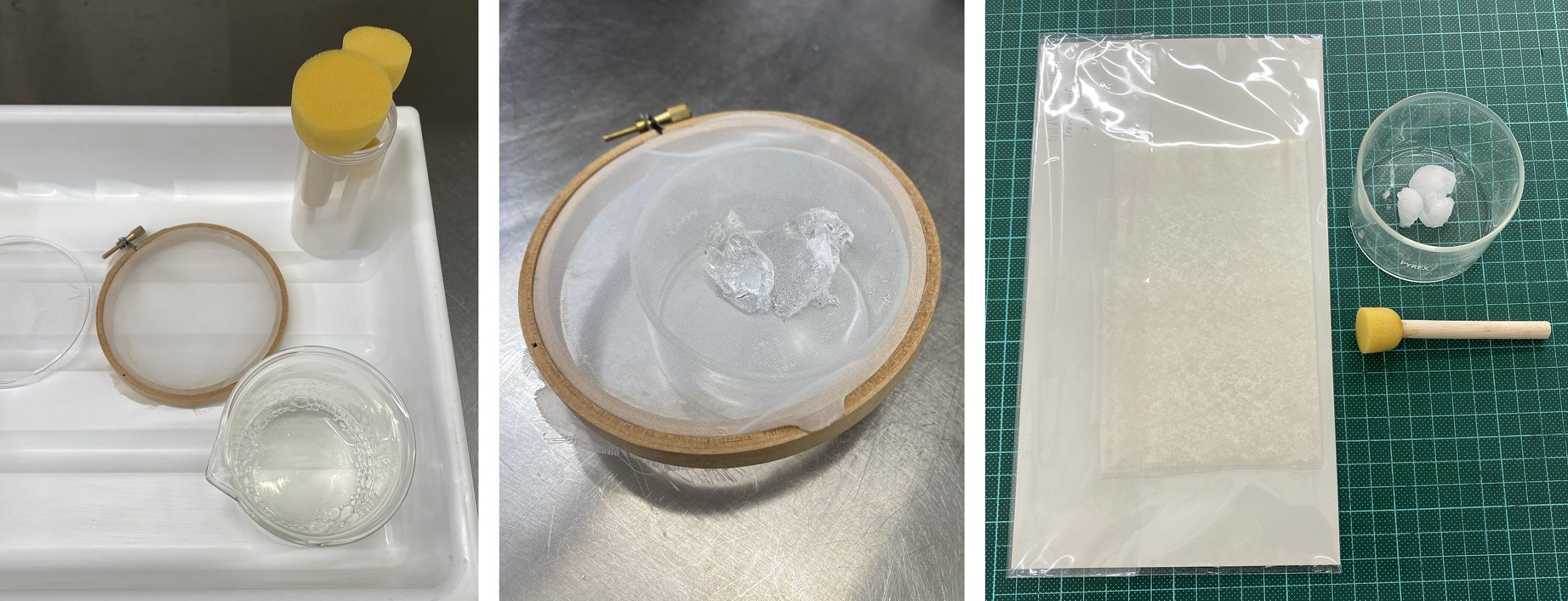 Selection of an appropriate adhesive was paramount, not only given the moisture sensitivity of parchment, but also the likelihood that iron gall ink was used in the text. Iron gall ink was popular for use on parchment given its ability to etch into the surface, reducing the risk of removal by rubbing or washing. However, its high acidity can cause corrosive deterioration of the underlying support and will migrate with moisture exposure! The use of gelatine mousse applied using a stencil sponge proved to be a good solution. Gelatine has capacity to bind reactive metals such as those in iron gall ink, while the use of a mousse enables adhesion with very minimal moisture.