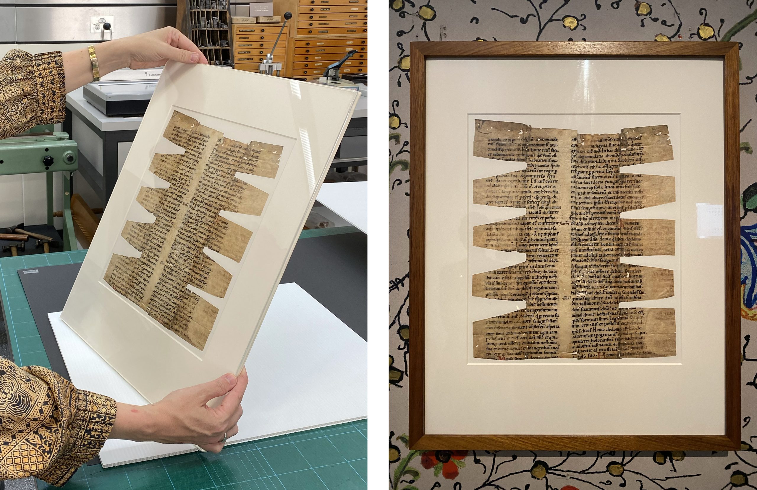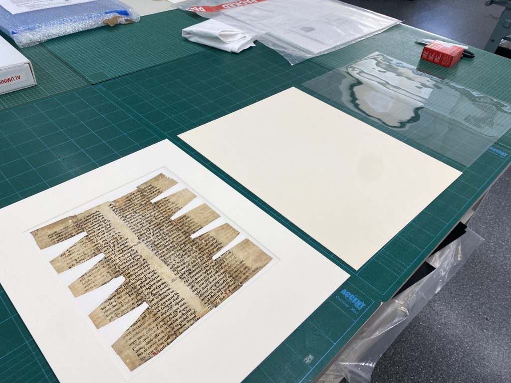The inlaid leaf was hinged into an archival window mount in preparation for framing. Given the known climatic sensitivity of parchment, the mount incorporated a micro-climate package to protect the parchment during display. This comprised of an airtight sandwich in which the mounted leaf is framed with a humidity stabiliser called Art Sorb, which is pre-conditioned to maintain environmental conditions appropriate for the preservation of parchment.