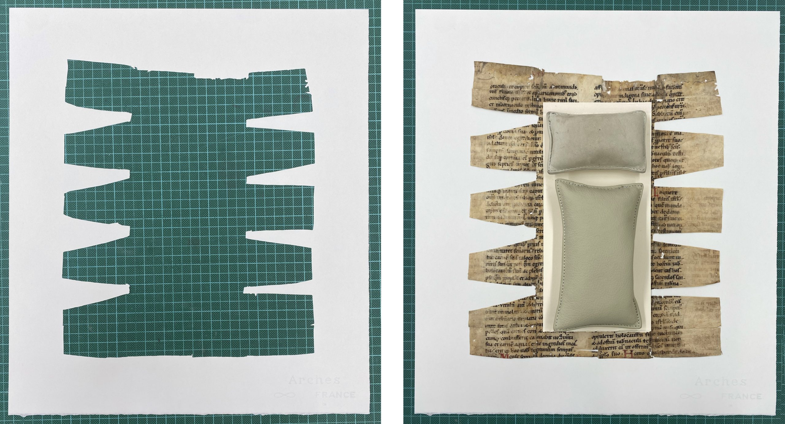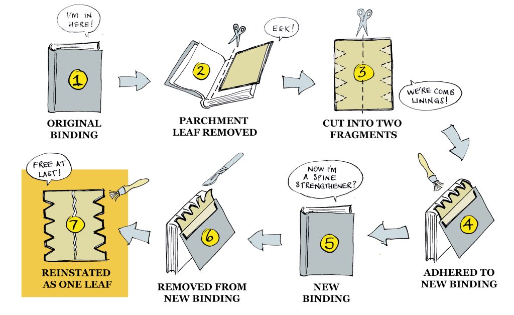 The leaf is made up of two notched fragments that have been adhered together, the shape indicating they were likely used as a ‘spine-strengthener’. First the parchment leaf was cut in half forming left and right pieces, then four wedges were cut along the outer sides to form two ‘comb linings.’ These pieces were adhered to the spine of another book, with the notched edges slotting between the raised bands of the spine and the straight edge attaching to the book covers to form a strong joint. See following image for a visualisation.