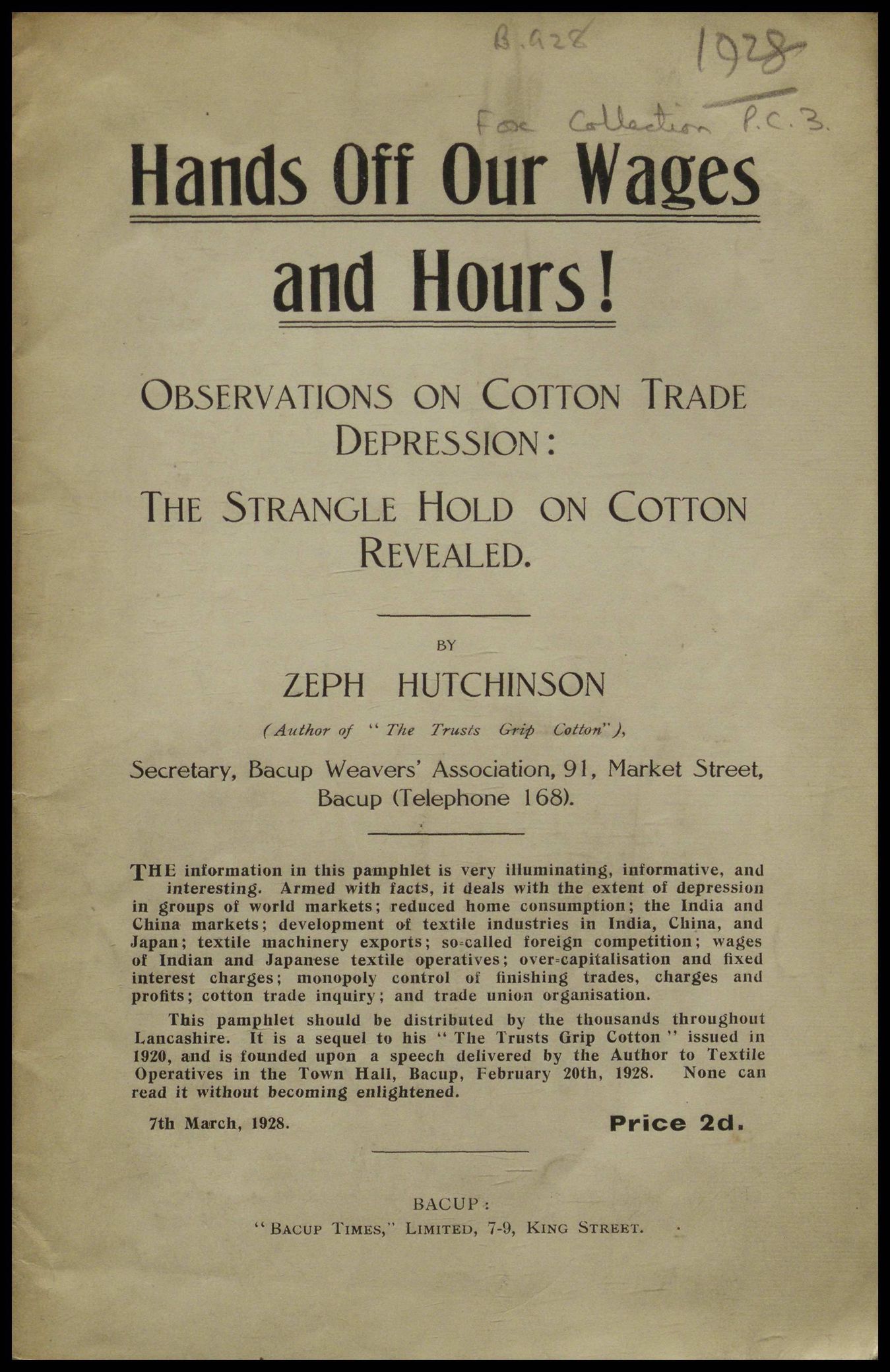 Right: Hutchinson, Zeph, 1928, Hands off our wages and hours! Observations on cotton trade depression: the strangle hold on cotton revealed, Bacup