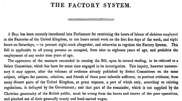 Material covering the rights of workers is well represented in the collection — discussions of various pieces of legislation, such as the Factory Act 1833, designed to improve conditions for workers and children — in mills and factories.