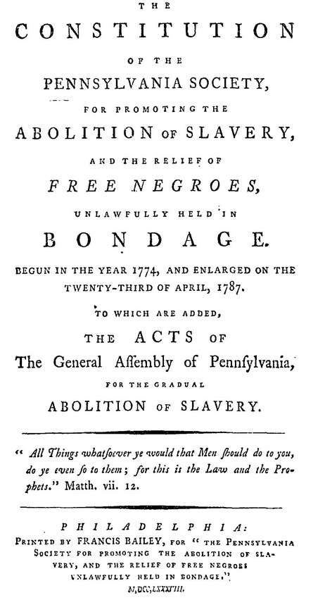 The Pennsylvania Society for the Abolition of Slavery operated from 1775 and is still active today as the Pennsylvania Abolition Society.