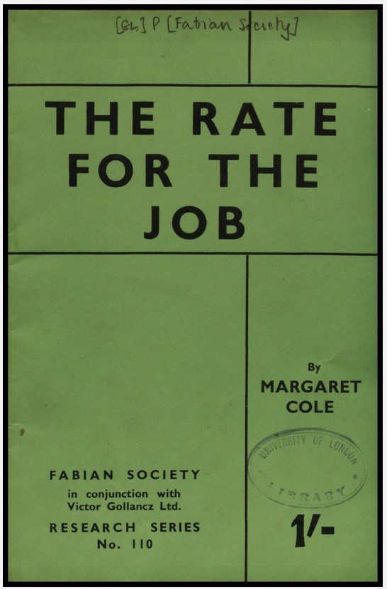 Still topical today, remuneration rates for women and men in Great Britain were investigated in the 1946 Royal Commission. The terms of reference were ‘to examine the existing relationship between the remuneration of men and women in the public services, in industry and in other fields of employment; to consider the social, economic and financial implications of the claim of equal pay for equal pay; and to report.’ As the title of this pamphlet published by the Fabian Society states: ‘the principle in the view of many organisations which have given evidence before the Royal Commission, including the Fabian Women’s Group should be the Rate for the Job, whoever, man, woman, boy of girl is doing the job.’