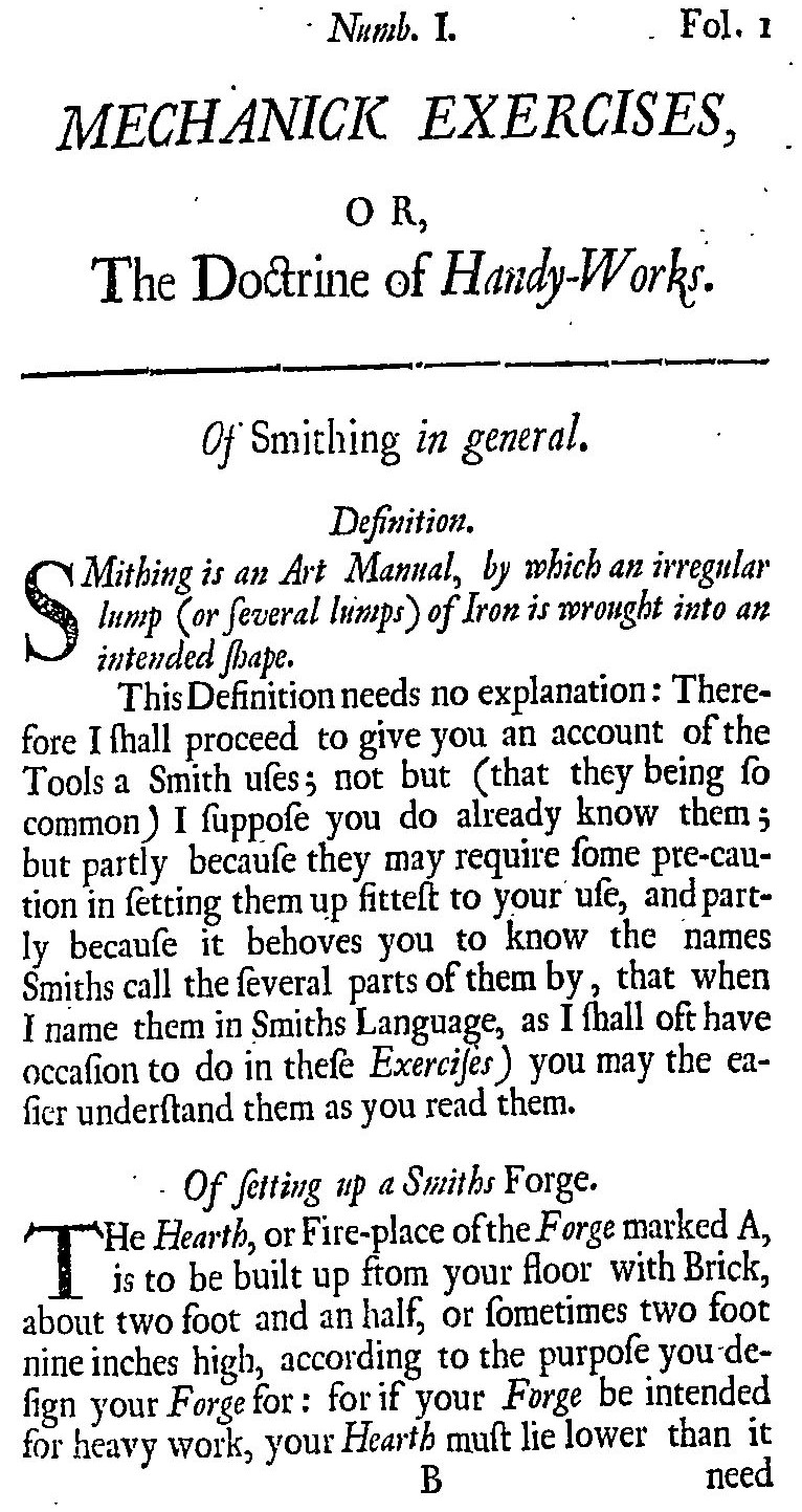 I see no more reason why the sordidness of some Workmen should be the cause for contempt upon Manual Operations than that the excellent invention of a Mill should be despised because a blind Horse draws in it. And through the Mechanicks be by some accounted ignoble and scandalous. Yet it is very well known that many gentlemen in this nation of good rank and high quality are conversant in Handy Works… if we ourselves were the first men, what branch of the Mechanicks we should first need… I I have considered and answer that without the invention of smithing primarily, most other Mechanick Invention would be at a stand. 2